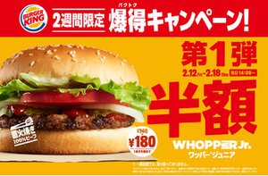 キャンペーンの第1弾は「ワッパーJr.」が通常360円のところ、半額の180円になるというもの。2月12日〜2月18日の1週間限定で、各日14時から実施する。1会計で5個まで購入できる。