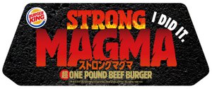 バーガーキングで2月26日〜3月11日の14日間、 各日14時〜限定で、総重量517g、 総カロリー1,483kcal、ビーフ総重量499gの「ストロング マグマ超ワンパウンドビーフバーガー」が新発売となる。価格は単品が1,380円(税込)、セットが1,680円(税込)。