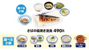 松屋の「さばの塩焼き定食」では “たっぷり脂がのったジューシーなノルウェー産のさば” を使用。選べる小鉢は「ミニ牛皿」「納豆」「冷奴」「国産とろろ」「ミニカレー」の5種類を用意。ここから好きな1品を選ぶことができる。