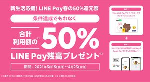LINE Payは、2021年3月15日から4月23日までの期間、Apple PayもしくはGoogle Payでの支払いと、Visa LINE Payプリペイドカードのオンライン支払いの両方利用で、合計利用額の50%分のLINE Pay残高をプレゼントする『新生活応援!LINE Pay 春の50%還元祭』を開催する。