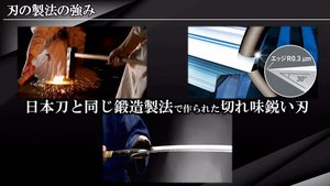 刃については日本刀の技術を活用しているとのこと。刃の素材には島根県安来市でつくられたヤスキハガネを使用しており、これは「通常の刃に比べて強度が高く摩擦に強い。替刃の回数が少なくて済むというメリットがある」とアピールした。
