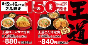 かつやは、カツ丼のおかずにカツが付く期間限定メニュー「王道ロースカツ定食」「王道とん汁定食」を5月12日(水)より発売する。価格は「王道ロースカツ定食」が1,133円(以下、価格はすべて税込)で、「王道とん汁定食」が1,089円。5月12日〜16日の5日間限定で、それぞれ150円引きで販売する。