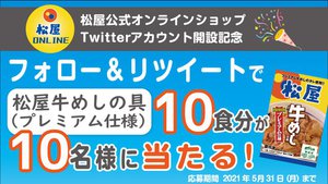 松屋フーズは、松屋公式オンラインショップのTwitterアカウントを新たに開設。これを記念し、『松屋 牛めし個食パック(プレミアム仕様)10個』が抽選で10名に当たるフォロー&リツイートキャンペーンを5月31日まで開催する。