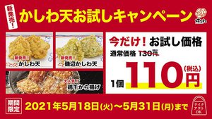 また、「かしわ天」に加え、「磯辺かしわ天」も期間限定で用意。こちらでは風味豊かな青海苔の香りを楽しめるとしている。さらに2021年1月から提供開始した「鶏千 から揚げ」も、同じく1個につき110円(税込、通常130円)で同期間販売される。
