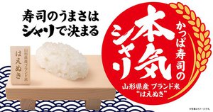 かっぱ寿司は、本日5月28日より、寿司のシャリを山形県産ブランド米「はえぬき」に変更すると発表した。ネタを乗せないシャリだけの一皿『本気シャリ』(3貫110円/店内税込価格/以下同)や、有名まぐろ仲卸「やま幸」が新シャリに合うまぐろを目利きした『やま幸の天然本鮪』(一貫330円)といった新商品も展開する。