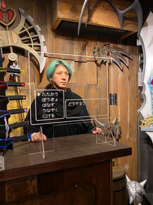 「たたかう」「ぼうぎょ」「はなす」「うなずく」「にげる」といった某ゲームの戦闘画面を彷彿とさせるデザインが施された飛沫防止パーテーション。なお、選択肢は「たたかう」で製作されたものとなる。