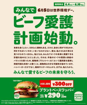 6月5日の世界環境デーに合わせて、バーガーキングでは「みんなでビーフ愛護計画」を始動。これにともない、お試し価格としてプラントベースワッパーを300円引きで販売する。