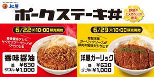 松屋は、期間限定メニュー「ポークステーキ丼」に、新ソース “洋風ガーリック” を6月29日10時から販売する。価格は並が630円、ダブルが1,000円。各プラス60円の生野菜セットも用意する(いずれも税込)。