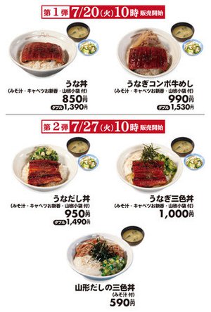 それぞれの価格はうな丼が850円(ダブル1,390円)、うなぎコンボ牛めしが990円(ダブル1,530円)、うなだし丼が950円(ダブル1,490円)、うなぎ三色丼が1,000円、山形だしの三色丼が590円。