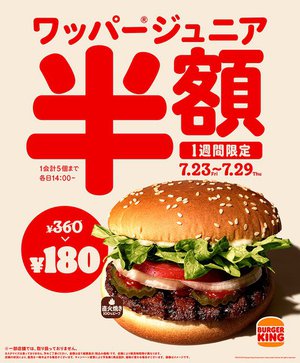 バーガーキングは、ハンバーガー「ワッパージュニア」を、7月23日から29日の1週間限定で各日14時から半額180円で販売する。