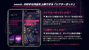 「シアターポッド」は、smash.の有料会員に向けた新機能。ユーザーがsmash.上の視聴ルームにあたる「ポッド」を作成し、上映リストに配信中の好きなコンテンツを追加し視聴することで、アプリを通じてオンライン上映会を楽しめるとしている。