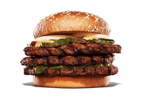 直火焼きの100%ビーフパティ3枚を最もおいしく食べられるように、チーズとソースの組み合わせにこだわったという限定メニュー。「大きく口を開けてお召し上がりいただき、ビッグバーガー新時代の到来をご体感ください」とアピールしている。