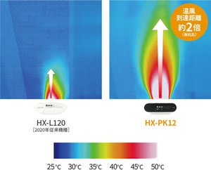 暖房・加湿ともに性能向上を図ったとする本機では、風路構造や内部ファンの形状を一新し、風量を従来機比で約30%アップ。温風到達距離は従来機比約2倍、最大加湿量は業界トップクラスの650mL/hを実現している。