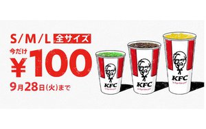 日本ケンタッキー・フライド・チキンは、全国店舗にて「ドリンク全サイズ100円」キャンペーンを9月15日(水)から28日(火)までの期間限定で開催する。