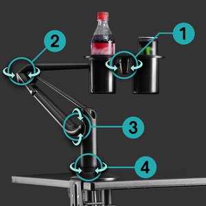 アームは計4箇所に関節を有し、細かな位置調整が可能。滑らかな可動で、好みの位置に飲み物をセットできる。また、ドリンクをデスクから浮かせて固定できるので、手元の邪魔にならず、飲み物をこぼすリスクも低減。高価なゲーミングデバイスが並ぶデスクでの使用に最適だと謳っており、同社は本品をデスクにマウントし、ホルダーにドリンクをセットすることで、手を使うことなくゴクゴク飲める『ゲーミング・ハイドレーションシステム』が構築できるとしている。