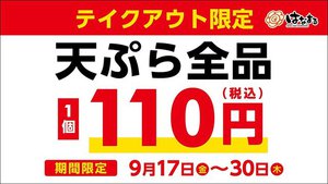 株式会社はなまるは、同社が展開する「はなまるうどん」「うまげな」「さぬき麺屋」「つるさく」などにおいて、「テイクアウト天ぷら全品110円(税込)キャンペーン」を9月17日から30日の期間限定で実施する。