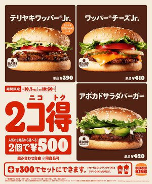 バーガーキングは、対象の3種のバーガーの中から2個を選んで500円(以下税込)で購入できる「2コ得(ニコトク)」キャンペーンを9月24日から10月7日の14日間限定で開催する。