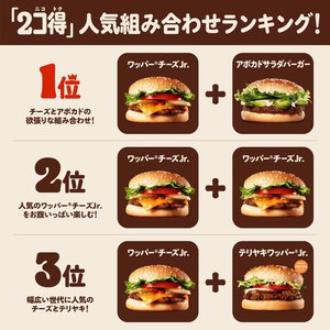 1位:「ワッパー(R) チーズJr.」+「アボカドサラダバーガー」