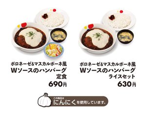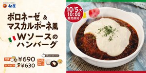 松屋は、新メニュー「ボロネーゼ&マスカルポーネ風Wソースのハンバーグ定食」を10月5日から販売開始する。価格は税込で、定食が690円、ライスセットが630円となる。