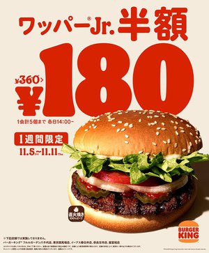 ビーケージャパンホールディングスは、バーガーキングの「ワッパージュニア」を11月5日から11月11日までの1週間、各日14時から半額の180円(以下、税込表記)で販売する。なお、購入可能なのは1会計で最大5個まで。