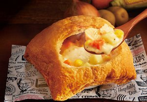 1996年の発売以来、多くの方から愛されている冬の名物メニューが今年も登場。国内産チキンとじゃがいも、にんじん、コーン、玉ねぎを使用した具だくさんのクリームシチューに、サックサクの食感に生まれ変わったパイ生地をのせて焼き上げている。