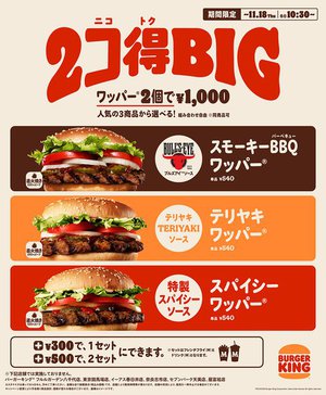 バーガーキングは、対象の3種のバーガーから2種を選んで1,000円(以下税込)で購入できる「2コ得(ニコトク)BIG」キャンペーンを、11月12日から11月18日までの1週間限定で開催する。