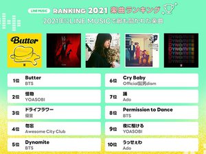 音楽ストリーミングサービス「LINE MUSIC」は、2021年に最も人気だった楽曲・アーティストをランキング形式で発表する「LINE MUSIC 年間ランキング2021」および「トレンドアワード」を発表。楽曲再生、アーティスト共にランキング1位はBTSが獲得した。