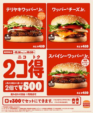 バーガーキングは、『テリヤキワッパー Jr.』『ワッパー チーズJr.』『スパイシーワッパー Jr.』の3商品から、 好きな2商品を選んで500円で買える「2コ得(ニコトク)」キャンペーンを、12月3日(金)〜12月16日(木)の14日間限定で実施する。 販売は各日10時30分から。
