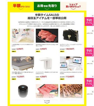 また、キャンペーンページでは、半額タイムSALEの超目玉アイテムを一部事前公開中。パナソニックのブルーレイレコーダーやNECのノートパソコンといったAV機器/ガジェット、シャープ「ヘルシオホットクック」を始めとする調理家電、松阪牛や大間産本マグロといったグルメなど、様々なアイテムが半額で提供される。