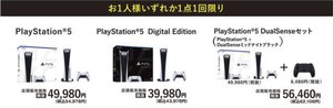 対象商品は、「PlayStation 5」「PlayStation 5 Digital Edition」、ミッドナイトブラックのDualSenseワイヤレスコントローラーが同梱の「PlayStation5 DualSenseセット」の計3種をラインナップ。なお、応募は各種とも1人いずれか1点限りとなる。