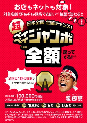 PayPay残高で買い物をすると最大で購入金額の全額(10万円まで)が戻ってくる「超ペイペイジャンボ」キャンペーンが、本日2月1日からスタートした。キャンペーン期間は3月31日(木)23時59分まで。