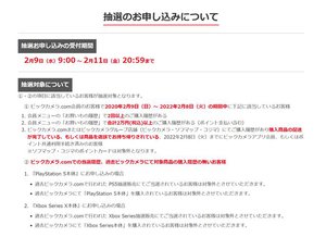 ビックカメラは、PlayStation 5(PS5)およびXbox Series Xの抽選販売申し込み受付を、本日2月9日よりビックカメラ.comにて開始した。申し込み期間は2月11日 20:59まで。