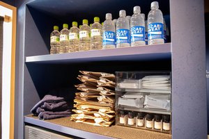 入り口にはブラシ等のアメニティのほか、水など飲料水、サウナハットといったサウナの必需品に加え、6種類のロウリュ用アロマも用意。バスタオル、フェイスタオル等もプランに含まれているため、手ぶらで行っても大丈夫だ。