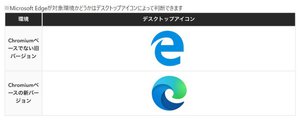 使用中のMicrosoft Edgeの旧バージョン/新バージョンはデスクトップアイコンによって判断可能。Chromiumベースでない旧バージョンのものは、旧Internet Explorerをイメージさせるようなアイコンになっている。