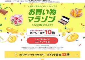 そして楽天「お買い物マラソン」は4月23日20時に開始され、4月28日1時59分(27日深夜25時59分)で終了を予定。セールとして一部値引きも行われるほか、楽天市場の特徴でもあるポイントアップが大量獲得できることを目玉としたイベントとなっている。