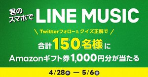 LINE MUSICは、同社公式Twitterアカウントにて抽選で合計150名にAmazonギフト券1,000円分をプレゼントするキャンペーン「#君のスマホでLINEMUSIC クイズ」を開始した。