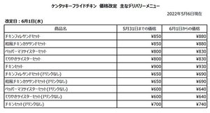小麦粉や食用油などの原材料価格の高騰や物流費の上昇などを踏まえ、慎重に検討した結果と説明。例えばチキンフィレサンドセットは現行の700円から740円(以後、価格はすべて税抜)に、オリジナルチキンは250円から260円に変更となる。なお、毎日10時から16時限定のケンタランチにおける「500円メニュー」や、 毎月28日限定の「とりの日パック(1,000円)」については、 価格の変更は行わない。