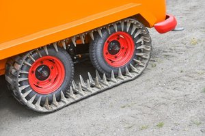 ただの四輪駆動車にするのではなく、ホイールを4軸8輪として、リヤの4輪を駆動輪とすべく自作のチェーン駆動機構を組み込み、キャタピラーを装着した。そしてフロント4輪は14インチの極太オフロードタイヤを履かせ、操舵機能を持たせた。