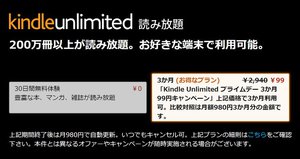 7月12日(火)・13日(水)に開催予定の「Amazonプライムデー」との連動キャンペーン。プライム会員かつ日本国内在住で、過去6ヶ月以内に無料体験やキャンペーンを利用していないユーザーを対象に、月額980円のKindle Unlimitedが3ヶ月(通常2,940円)の間、99円で利用でき、200万冊以上が読み放題となる。自身が対象条件を満たしているかは、Kindle Unlimitedトップページの本プラン表示の有無で確認できる。