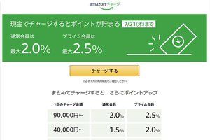 またチャージ額によって還元されるポイントも変わり、9万円以上チャージすると、最高で3.0%のポイントがもらえる。通常は最高2.5%のところ、プライムデーにあわせて還元率が高まっているのだ。プライムデーで大きな買い物をする予定がなくても、この期間中にチャージしておくのがオススメだ。