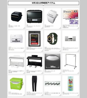9月4日(日)10時からは、パナソニックのブルーレイレコーダーや富士通のノートPC、リコーのタフネスデジカメ、エレコムのモバイルバッテリーなどが登場。調理家電や電子ピアノなど、そのほかにもさまざまなジャンルのアイテムがセール対象になる。