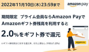 Amazonの決済サービス「Amazon Pay」は、対象のECサイトでAmazonギフト券残高を利用することで、支払い金額の2.0%を還元するプライム会員向けのキャンペーンを実施中だ。期間は11月10日23時59分まで。