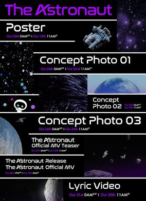 BIGHIT MUSICの公式SNSが発表した「The Astronaut」のプロモーションマップによると、今回のポスター画像の公開に続いて、10月24日にコンセプトフォト01、10月25日にコンセプトフォト02、10月26日にコンセプトフォト03が公開される。