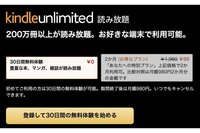 Kindle Unlimitedは本にマンガ、雑誌と200万冊以上が揃う読み放題サービス。はじめて利用する場合は30日間の無料体験が可能で、それ以降は月額980円で継続できるが、いまは2ヶ月99円で利用可能な特別キャンペーンも提供されている(Kindle Unlimitedのページでキャンペーン画面が表示されている方が対象)。