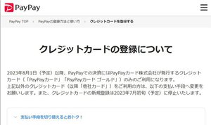 それに先立ち、2023年7月初旬ごろより、クレジットカードの新規登録を停止。既に登録済みの「PayPayカード」「PayPayカード ゴールド」以外の他社クレジットカードについては、8月1日をもって登録を解除するとしている。また、「PayPayカード」「PayPayカード ゴールド」は、「PayPayあと払い」に登録するかたちで引き続き利用できる。
