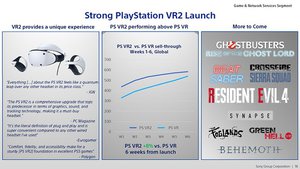 PS5の周辺機器については、ワイヤレスコントローラー「DualSense」やヘッドホンなど様々な製品で前年を上回る売上を記録。PlayStation VR2も好調で、発売初期の売上は初代PS VRを上回って推移していると紹介した。