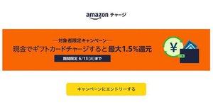 Amazonは、Amazonギフトカードを現金でチャージすることで最大1.5%還元されるキャンペーンを開催中。キャンペーン期間は6月13日までと、本日が最終日になっている。