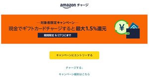 Amazonは、「Amazonギフトカード」を現金でチャージすることで最大1.5%還元されるキャンペーンを開催している。キャンペーン期間は6月27日までとなっている。