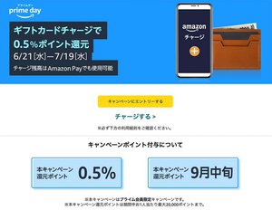 Amazonギフト券 チャージタイプは、「先に自分で任意の金額をチャージすることで使えるギフト券」のこと。これだけだと、1000円チャージしたら1000円分のギフト券を使えるようになる、というだけでお得ではないのだが、今回はAmazonプライムデーに合わせて、「0.5%ポイント還元キャンペーン」が開催されているのだ。