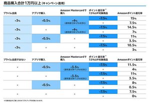 増えるポイントの内訳は、プライム会員なら+3%、Amazon Mastercardでの買い物なら最大+4%、Amazonショッピングアプリからの買い物で+0.5%、Amazonデバイスの購入で+7.5%。最後の「Amazonデバイスの購入」という条件を除けばあらゆる製品が対象となるので、事前にエントリーボタンをクリックしておくのがオススメだ。